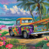 Bask in the sunny bliss of a perfect day where a colorful truck stands ready to chase the waves under a glorious blue sky. In the truck’s bed, a surfboard eagerly awaits its rider to conquer the ocean’s rolling waves. Surrounding the scene are swaying palm trees and vibrant tropical flowers, painting a picture of paradise.