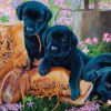 Okay, seriously, who could resist that cute little puppy with the shoelace over his nose? Oh my goodness! And that other one eating the shoelace… dog lover or not, you have to admit that is super cute! Never mind the gorgeous flowers and the fine detail on the old, worn boots.