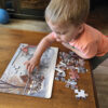 Mable and Johnny sure picked a swell place to build their snowman in this 35 piece tray puzzle snow adventure! It looks like Fletcher, the dog, is going to pull Johnny’s scarf right off! And Dexter, the horse, thinks his next meal is on the snowman’s head! Hopefully there are more supplies in little Mable’s box!