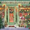 Christmas Flower Shop by Barbara Behr is a 1000 piece vintage themed puzzle highlighting the Cobble Hill Flower Shop during the Christmas season. A faithful dog sits in the snow staring through the shop door at the beautiful flowers while his well dressed owners pick out their Christmas tree. The street lantern and Christmas lights bring a warm glow to the centre of the puzzle, while the outer edges and trees will have a big more shadow.