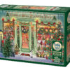 Christmas Flower Shop by Barbara Behr is a 1000 piece vintage themed puzzle highlighting the Cobble Hill Flower Shop during the Christmas season. A faithful dog sits in the snow staring through the shop door at the beautiful flowers while his well dressed owners pick out their Christmas tree. The street lantern and Christmas lights bring a warm glow to the centre of the puzzle, while the outer edges and trees will have a big more shadow.