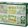 Cottage Gardens 1000 piece puzzle features six whimsical scenes of flower fields, cute camper, a greenhouse, and a lovely little cottage. The scenes are postcards pinned to a wooden board. Would these pretty pastel scenes be on your vision board?