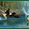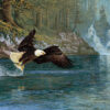 It doesn’t take a human for Fly Fishing to happen! A gorgeous eagle quickly swoops down from the sky to snatch a fish from the water without hesitation. The detail of light and colours in the water creates a great sense of tranquility being disrupted while nature does what it does best – live and breathe! In the background, one can see another eagle seeking its own catch as it soars near the waterfalls.