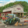 Featured in the puzzle is a big aged wooden A-frame roof of a General Store with an attached red brick building. The General Store has been established since 1933. There are several hanging flower pots and planters along the front of the store. Looking at the image, on the left side there are two bicycles resting against the wall. On the right side of the image is a vintage black truck with an open back. An older gentleman sits on his chair with his dog laying on the gravel next to him. In the foreground of the image is a Green Grocer vintage truck with a cargo bed full of fruits and flowers. The tail gate is down. There are a lot of chickens roaming freely on the paved road and a red wagon with three cute puppies sitting inside. The adult dog is seen from behind, looking at them, with a couple of other puppies on the road. The background, which is shy of one-third of the puzzle features tall green trees and a little bit of blue sky on the left and right corners.