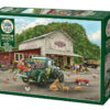 Featured in the puzzle is a big aged wooden A-frame roof of a General Store with an attached red brick building. The General Store has been established since 1933. There are several hanging flower pots and planters along the front of the store. Looking at the image, on the left side there are two bicycles resting against the wall. On the right side of the image is a vintage black truck with an open back. An older gentleman sits on his chair with his dog laying on the gravel next to him. In the foreground of the image is a Green Grocer vintage truck with a cargo bed full of fruits and flowers. The tail gate is down. There are a lot of chickens roaming freely on the paved road and a red wagon with three cute puppies sitting inside. The adult dog is seen from behind, looking at them, with a couple of other puppies on the road. The background, which is shy of one-third of the puzzle features tall green trees and a little bit of blue sky on the left and right corners.