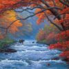 Autumn may be in full splendor with its traditional oranges and greens, but after a long day of hunting to fill up for winter, this bear is Headed Home. Not even the rushing creek in a quiet forest can stop it.