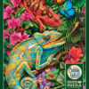 Who has Culture Club running through their brain right now? Anyone? Karma Chamelon is exploding with bright colours and personality. Chamelons are known for being camouflaged, so this puzzle wouldn’t be perfect without a little hidden reptile in the scene. Did you spot him? These three have made friends with the butterflies, but regular ol’ flies aren’t so lucky as that long tongue whips out to have a tasty treat on this beautiful afternoon in the jungle. A thrilling puzzle from Lori Anzalone.
