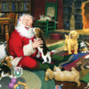 The puppies are always happy when it’s Santa’s Playtime! Mr. Claus does a good job sharing his love with these adorable doggies who want to cuddle and have a good time. The cute little cat keeps her distance while she relaxes on the chair by the fireplace. She loves Santa, but her focus is more on the glass of milk on the table!