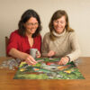 The Summer Birdhouse is full of feathered friends today! This sunny 500 piece puzzle features cardinals, blue birds, nuthatches, yellow finches, and butterflies – along with beautiful green foliage from the pink and blue flowers. There’s also a touch of Queen Anne’s Lace at the bottom right corner. This aged wooden birdhouse with a green roof is attached to an old wood fence. The white paint is chipping off, but these birds don’t mind at all! The birds and birdhouse are clearly in focus, but the top third of the puzzle has a blurred background, which may pose as a slightly more challenging puzzle to some. Luckily, the 500 piece puzzles have larger sized pieces, so one gets more detail per piece making it easier to assemble! This puzzle has a portrait orientation and is something to consider for those who have a harder time reaching across a table.