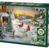 The evening glow is settling over the quaint little town, and the Sunset Cardinals are in a flurry of excitement, gathering near the Timm home to discuss the curious open mailbox! No need to fret—Sam is on his way back, bringing the kids home from their horse-drawn carriage ride. With the crisp cold keeping the snow firmly in place, there’s no chance of any melting, so the package is safe and sound. The pond nearby is almost frozen over, reflecting the warm light from the charming church, completing this picturesque winter scene. It’s the perfect moment to slow down, relax, and piece together this serene, snowy evening.