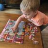Jars and jars on shelves and shelves of Sweet Sweet Sugar! Can’t go wrong with this much eye candy! A tray puzzle is durable inlaid pieces in a tray with definitive outlines underneath to help idenity where each piece goes. The large pieces makes it easy for hands to grasp and allows for those needing more visual cues to see a greater portion of the image per piece. Recommended for ages 3+.