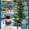 A horse drawn carriage transports a couple across the snowy path as they take in the beauty of the charming village. A faithful dog leads the way using the lampposts as his guiding light. The village twinkles with festive lights, casting a warm glow over the scene. Under a quaint bridge, a gentle stream flows and across the way, a family skates on the frozen pond. Yet, the true focal point remains the towering Village Tree adorned with a magnificent golden star, radiating the spirit of the season.