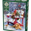 The red adirondack chair makes a great meeting place for both dogs and birds alike. It’s nice to see so much activity in the cold winter snow.